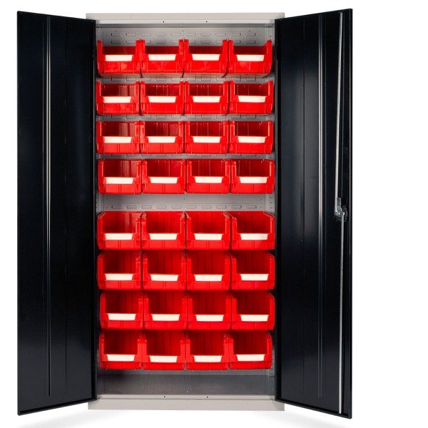 This stylish range of practical 32 Bin Storage Cupboard are suitable for both commercial and industrial purposes, including schools, offices, hospitals, workshops and warehouse. Â Featuring 32 plastic bins, multi-point locking and strong hinges as standard, these cupboards are will keep their small contents safe.