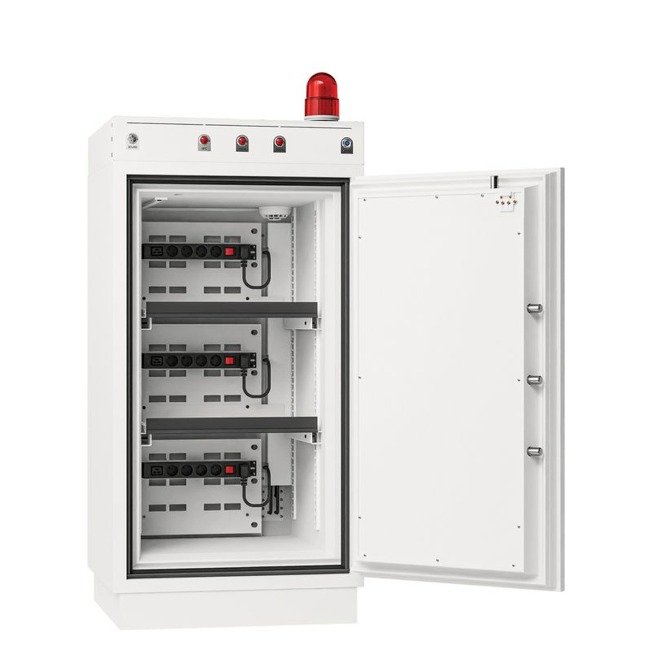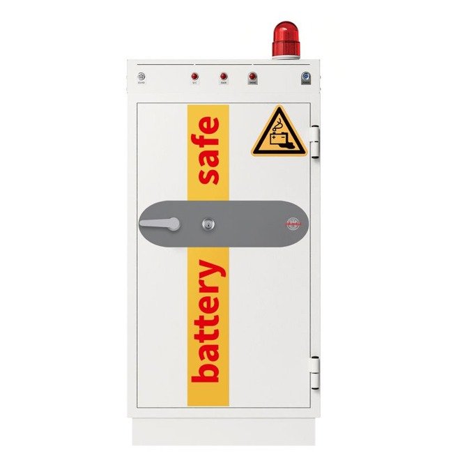 The BATTERY COMMANDER SERIES is certified to VDMA 24994:2024-08 standard by ECB.S and constructed to safeguard both lives and property from the potentially catastrophic consequences of Lithium battery fires. Providing a secure storage and charging solution tailored for Lithium-Ion batteries, these units mitigate the myriad of risks posed by such batteries, including thermal runaway due to temperature fluctuations, impact, or manufacturing defects. Such hazards can lead to spontaneous ignition and formidable fire outbreaks, that pose significant challenges for extinguishment.